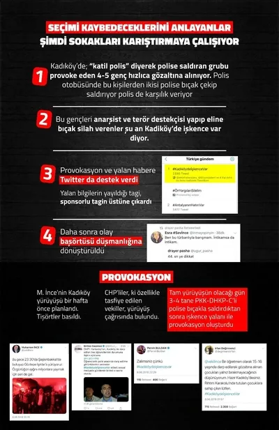 24 Haziran seçimleri yaklaştıkça köşeye sıkışan CHP ve militanları siyasal tetikçiliğe soyundu. "Kadıköy'de gençlere polis şiddeti" yalanıyla algı ve mağduriyet yaratarak provokatif eylemlerle kaos peşine düşenlerin yalanı deşifre oldu